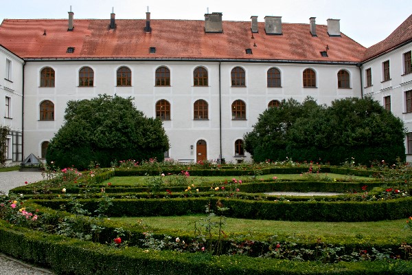 Blick über den Hof (Rosengarten) zum Konventstock des Augustiner-Chorherrenstift