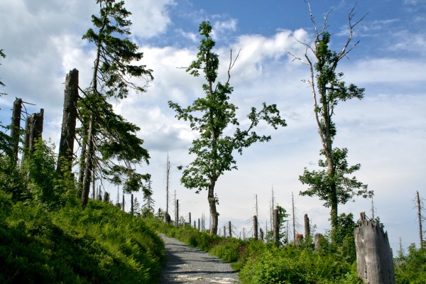 Blick über den toten Wald mit Baumstümpfen (Borkenkäfer) am Lusen