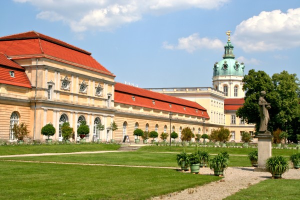 Die sich westlich an die Dreiflügelanlage des Schlosses Charlottenburg anschließende Orangerie, die aus der Erweiterung von 1713 durch Eosander von Göthe stammt. mit Blick zum Kuppelbau des Schlosses