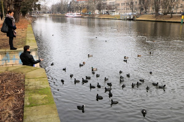 Enten und Bläßhühner auf der Spree am Schloßpark Charlottenburg bei Fütterung durch Spaziergänger