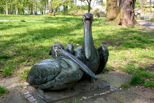 Die Skulptur Pelikanpaar im Ruhwaldpark neben der Säulenhalle, geschaffen von E.-Otto Eichwald, aufgestellt 1963. Ein weiterer Abguß steht am Karolingerplatz.