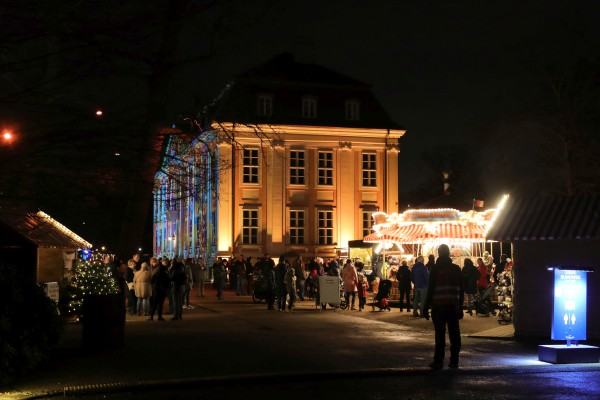 Blick über den Rundweg auf Karussell, Verkaufsstände und Gastronomie sowie das Schloß Friedrichsfelde im Hitnergrund