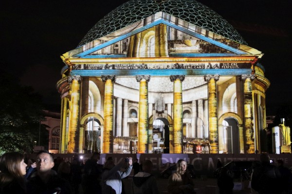Architekturinszenierung auf der Fassade der St. Hedwigs-Kathedrale am Bebelplatz