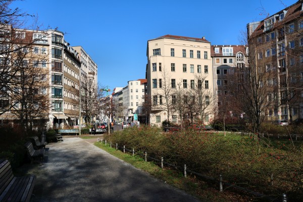 Blick über den Koppenplatz Richtung Ackerstraße. Der Koppenplatz ist ein ehemaliger städtischer Armenfriedhof, der zwischen 1704 und 1853 bestand. Gegründet vom Stadthauptmann und Ratsverwandten Christian Koppe