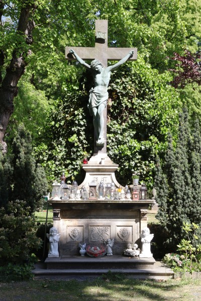 Kruzifix auf Rondell des Hauptweges des Alten Michael-Kirchhofes an der Hermannstraße, mit vielen Grablichtern und kleinen Statuen