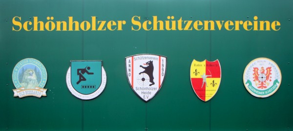 Mittelbau der Schießanlage Schönholz an der Hermann-Hesse-Straße mit Jagdreliefs und den Wappen der Schönholzer Schützenvereine