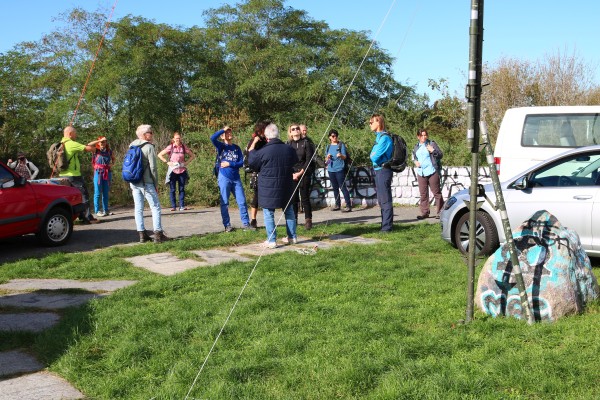 Wandergruppe auf dem Gipfel des Freizeitparks Lübars, der Lübarser Höhe, am Tag der Wanderung von Funkamateuren genutzt