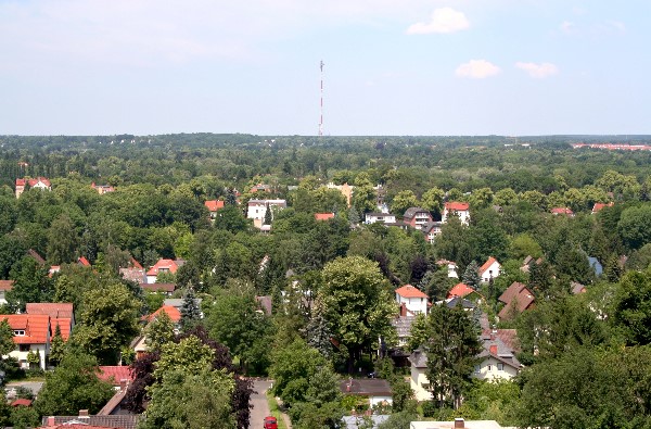 Blick vom Hochhaus der Rollbergesiedlung am Zabel-Krüger-Damm nach Norden auf über Waidmannslust und Hermsdorf zum Fernmeldeturm in Frohnau