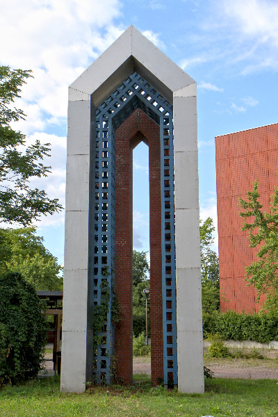 Begrüntes Tor der Handwerker vor dem Eingang zum Oberstufenzentrum Bautechnik (Knobelsdorffschule) an der Nonnendammallee