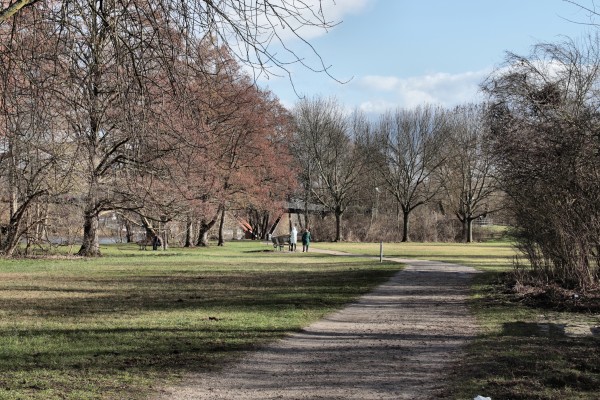 Uferweg auf dem Südufer des Hohenzollernkanals, Blick nach Osten über Wiese in Richtung auf den Saatwinkler Steg