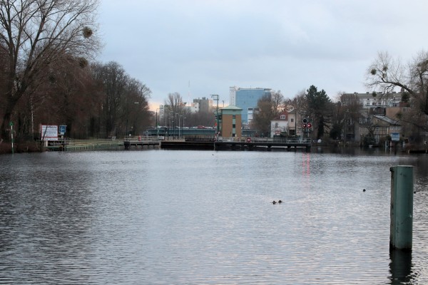 Blick vom Wröhmännerpark nach Süden über die Havel zur Schleuse Spandau