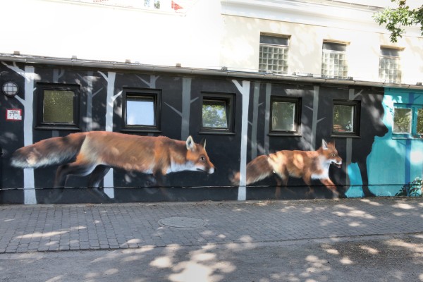 Wandmalerei "Füchse" auf dem Schulhof der Schule an der Jungfernheide (Robert-Reinick-Schule)