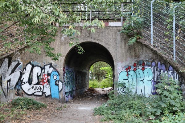 Fußgängertunnel unter Siemensbahn nördlich vom Popitzweg, vom Fußweg südlich des Bahndamms zur Goebelstraße