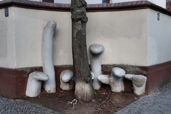 Skulpturen und Mosaiken von Eckart Haisch und Anita Lüdtke geschaffen mit Anwohnern (1985) in der Lynarstraße. Hier Finger bzw. Sprossen an der Ecke Hedwigstraße