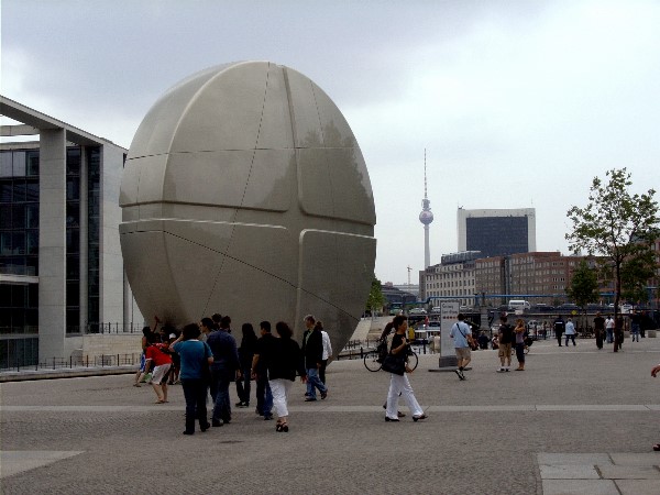 Germany - Land of Ideas: Beispiel Aspirin (Bayer), eine Tablettenskulptur am Reichstagsufer, im Hintergrund Fernsehturm am Alexanderplatz
