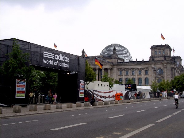 Nachbau des Berliner Olympiastadions auf dem Platz der Republik vor dem Reichstagsgebäude genutzt als die "adidas world of football". Der Nachbau wurde nach der WM wieder abgebaut. Blick über die Scheidemannstraße zum Reichstagsgebäude |