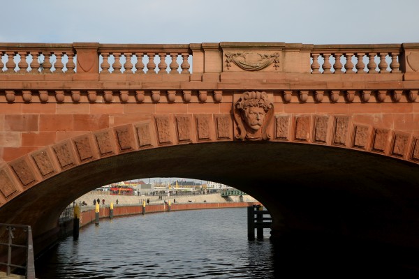 Blick durch eine Torbogen der Moltkebrücke über der Spree nach Osten mit der Rahel-Hirsch-Straße im Hintergrund