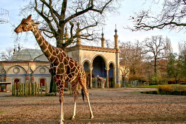 Giraffe vor einem der noch bestehenden alten Tierhäuser (Antilopenhaus)