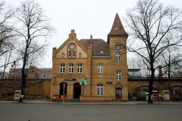Bahnhofsgebäude des Bahnhofs Wollankstraße an der Nordbahnstraße von der Sternstraße aus