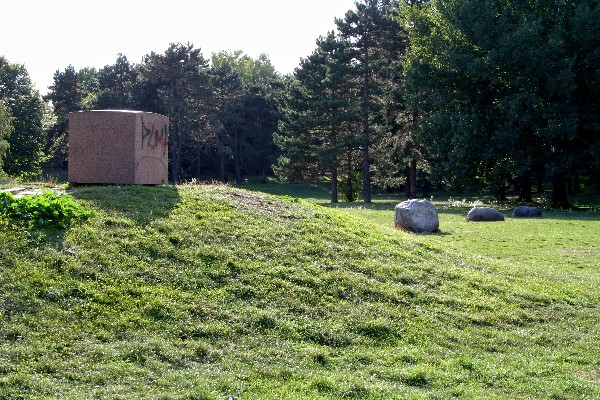 Hügel mit dem Gedenkstein zum Volkspark Rehberge und einer Findlingsreihe |
