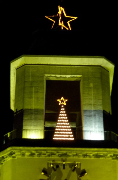 Turm des Rathauses Spandau mit Weihnachtsbeleuchtung