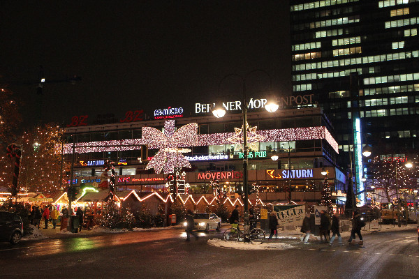 Blick über den Kurfürstendamm auf den City-Weihnachtsmarkt auf dem Breitscheidplatz mit dem Europa-Center dahinter
