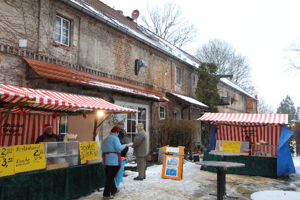 Imbißstände des Weihnachtsmarkts auf dem Gutshof Gatow und Remise