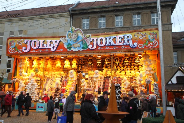 Losbude "Jolly Joker" auf dem Weihnachtsmarkt im Rummelbereich am Rathaus Spandau