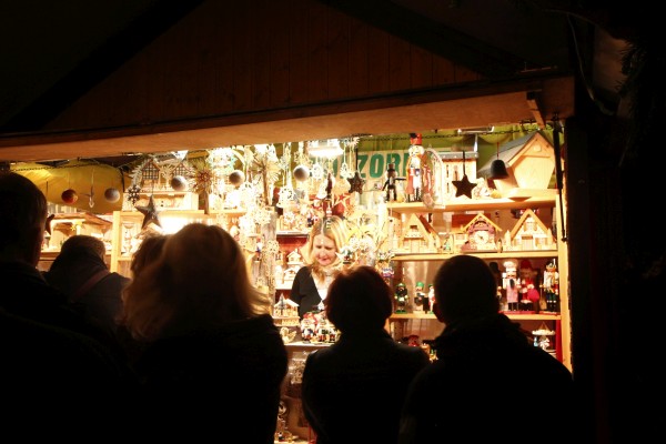Stand mit Dekorationsartikeln aus Holz auf dem Weihnachtsmarkt vor dem Schloß Charlottenburg