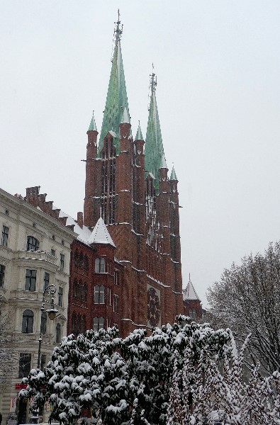 Verschneite Büsche auf dem Mittelstreifen der Yorckstraße mit Blick zur Bonifatiuskirche