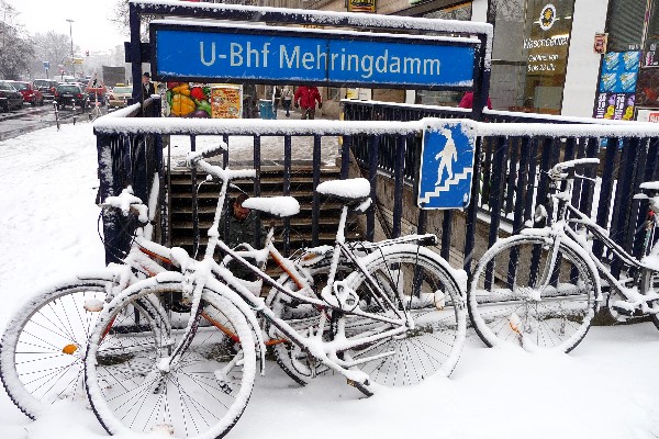 Fahrräder am Eingang des U-Bhfs Mehringdamm im Schnee