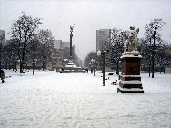 Blick über den verschneiten Mehringplatz (früher Belle AlliancePlatz) in die Achse der Friedrichstraße |