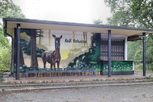 Kiosk Rehwiese mit Graffitimalerei von Artmos (Motiv: Reh) an der Spanischen Allee an der Bushaltestelle An der Rehwiese