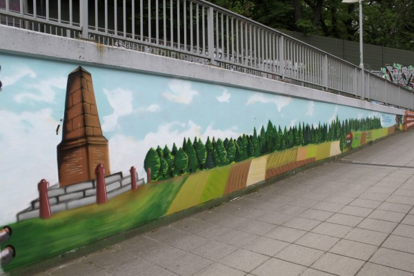 Die Wände der Rampen der Bahnunterführung in Dallgow wurden mit Darstellungen aus Dallgow in Form eines Bilderbuches neu gestaltet, hier der Obelsik auf dem Hasenheider Berg in der Döberitzer Heide |