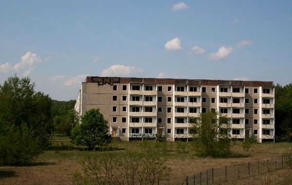 Plattenbau aus der Zeit der Sowjets von 1983 an der "Untereren Dorfaue" (neben dem Hindenburghaus) des Olympischen Dorfes von 1936, ein Standardbau aus dem DDR-Wohnungsbau, steht seit dem Abzug der Roten Armee leer