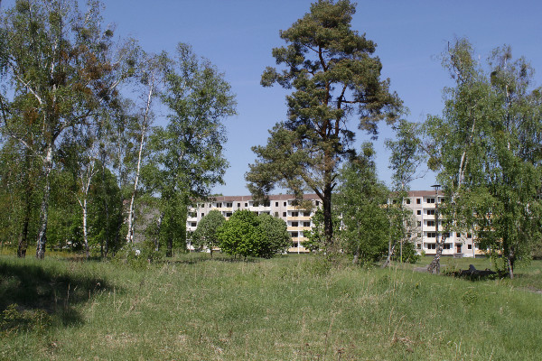 Blick über das Geländes des Olympischen Dorfes auf einen Plattenbau aus der Zeit der Sowjets von 1983 an der "Untereren Dorfaue"(neben dem Hindenburghaus), ein Standardbau aus dem DDR-Wohnungsbau, steht seit dem Abzug der Roten Armee leer