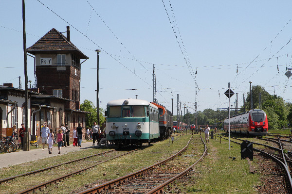 Blick auf das Rangierstellwerk RS IV mit historischen Triebwagen davor, |