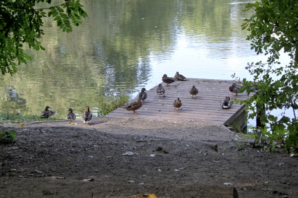 Enten auf dem Steg des Panzerteichs (Lake)