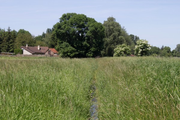 Blick über die Wiese am Schlaggraben zum Siedlungsbereich an der Erlenstraße