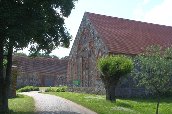 Blick über die Straße auf die ehemaligen Scheunen von Bülowssiege, Feldsteinmauerwerk mit gotisierenden Backsteinlisenen in der Giebelfassade
