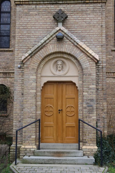 Eingang zur Dorfkirche Glienicke an der Hauptstraße mit Medaillon, Rundbogen, Blendgiebel und Kreuzblume