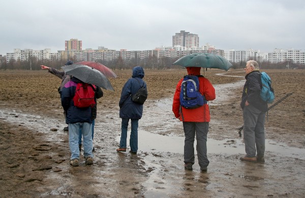 Die Wandergruppe im Regen auf der Osdorfer Feldflur vor der Silhouette der Stadtrandsiedlung Marienfelde