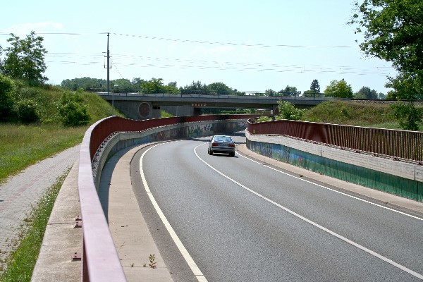 Blick auf die Unterführung des Ihlenwegs (B102 von Neuruppin) unter die Bahntrasse.
