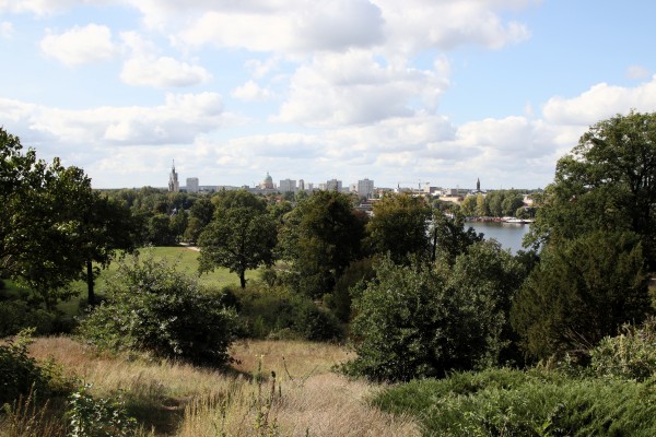 Blick vom Rondell am Flatowturm nach Süden auf Potsdam. Mit dem Türmen der Heilig-Geist-Park-Residenz, der Nikolaikirche und der Peter-Paul-Kirche
