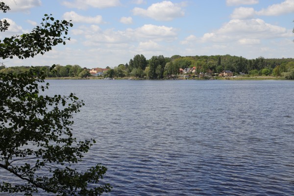 Blick vom Deichweg an der Kuhseetränke über die Untere Wublitz auf Häuser von Leest
