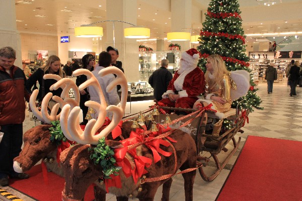 Rentierschlitten mit Weihnachtsmann und Engel im Eingangsbereich des Karstadt-Kaufhauses