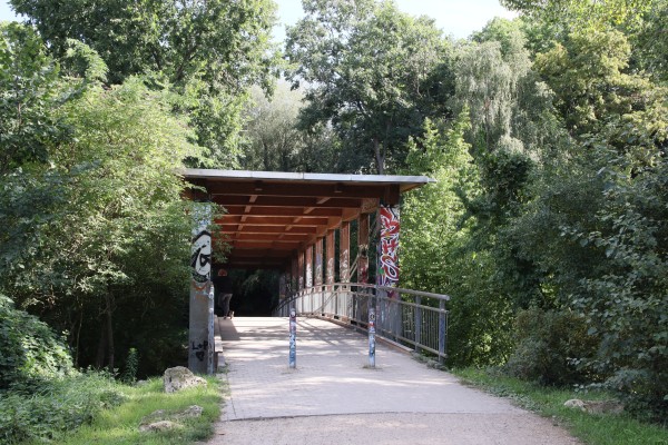Blick auf die hölzerne Brücke über die Nuthe im Nuthepark