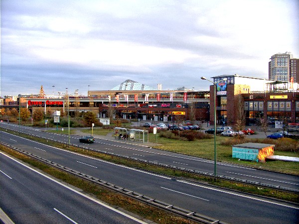 über die Nutheschnellstraße von der Fußgängerbrücke aus gesehen. Das Stern-Center wurde am 24.10.1996 eröffnet und weist eine Verkaufsfläche von 35.000 m² auf, daneben noch 5.000 m² Gastronomiefläche und Büro- und Praxisflächen.