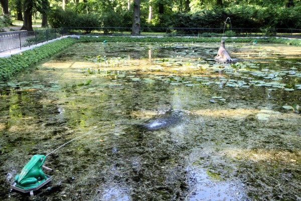 Blick auf den Goldfischteich im Stadtpark mit wasserspeiendem Frosch und Seehund mit Fontäne