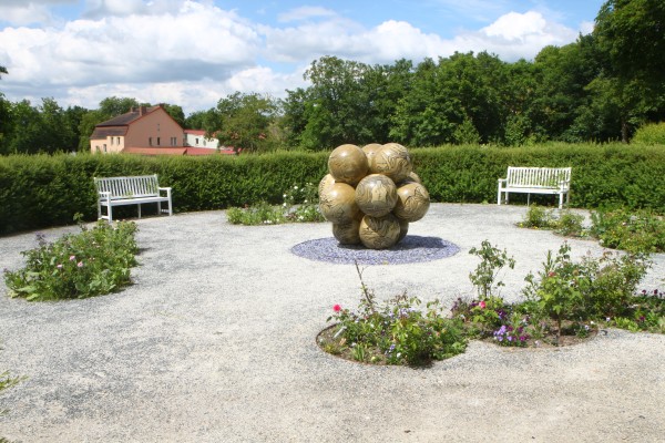 Im Zentrum des Gartens eine Kugelskulptur nach dem Bild Der Kuss von Gustav Klimmt.